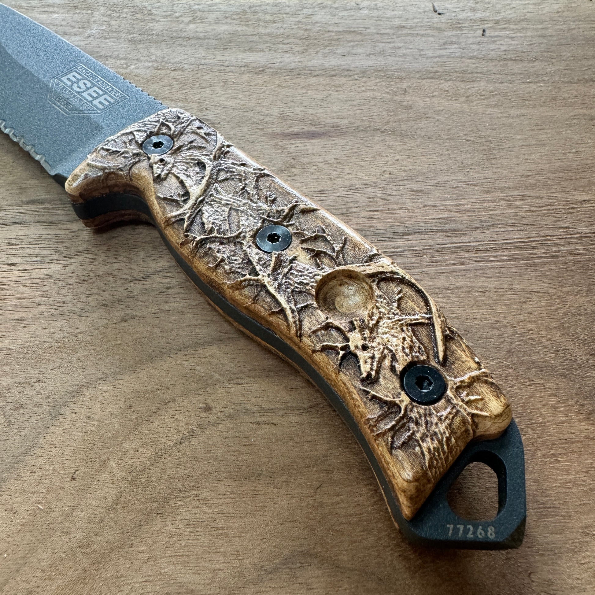 Elevate the look of your ESEE-5 knife with this meticulously crafted handle, designed for enthusiasts who appreciate a touch of the macabre. This handle is not your average accessory; it's a statement piece that combines functionality with a bold aesthetic.