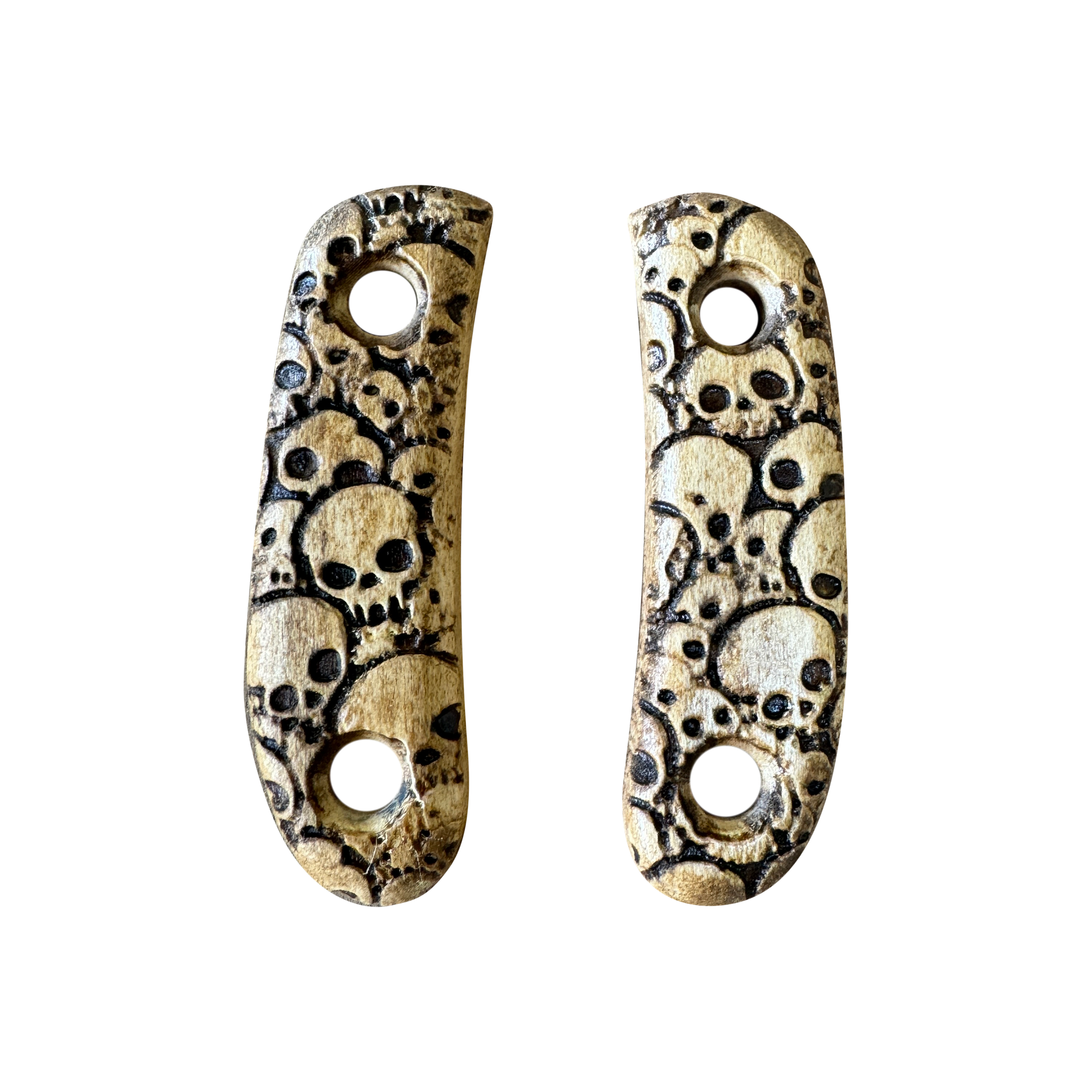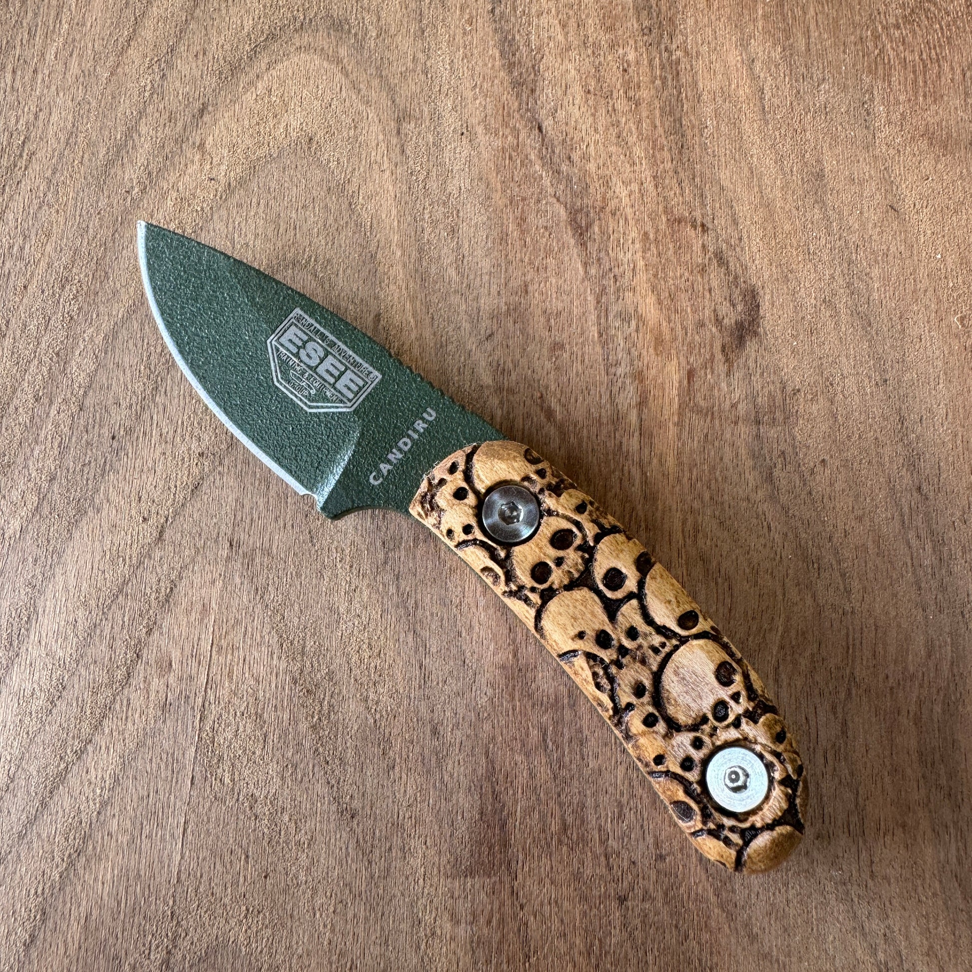 Elevate the look of your ESEE Candiru knife with this meticulously crafted handle, designed for enthusiasts who appreciate a touch of the macabre. This handle is not your average accessory; it's a statement piece that combines functionality with a bold aesthetic.