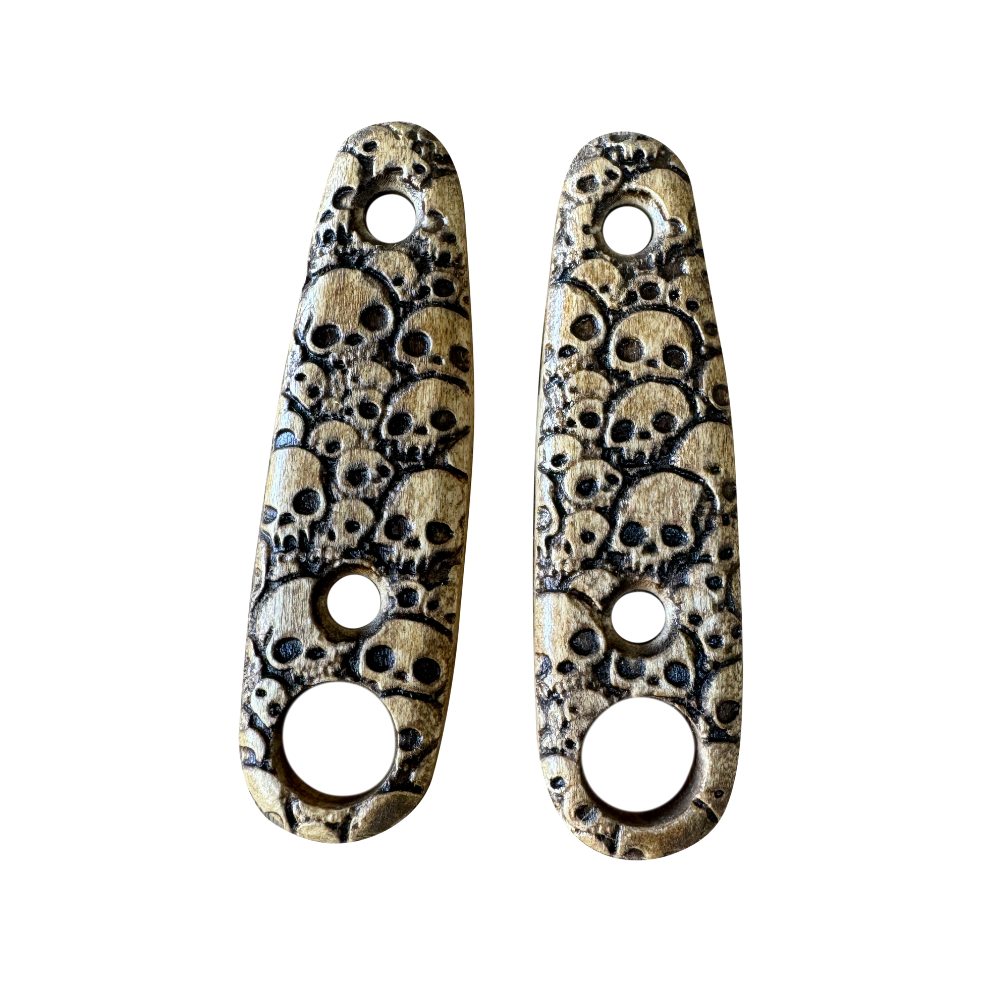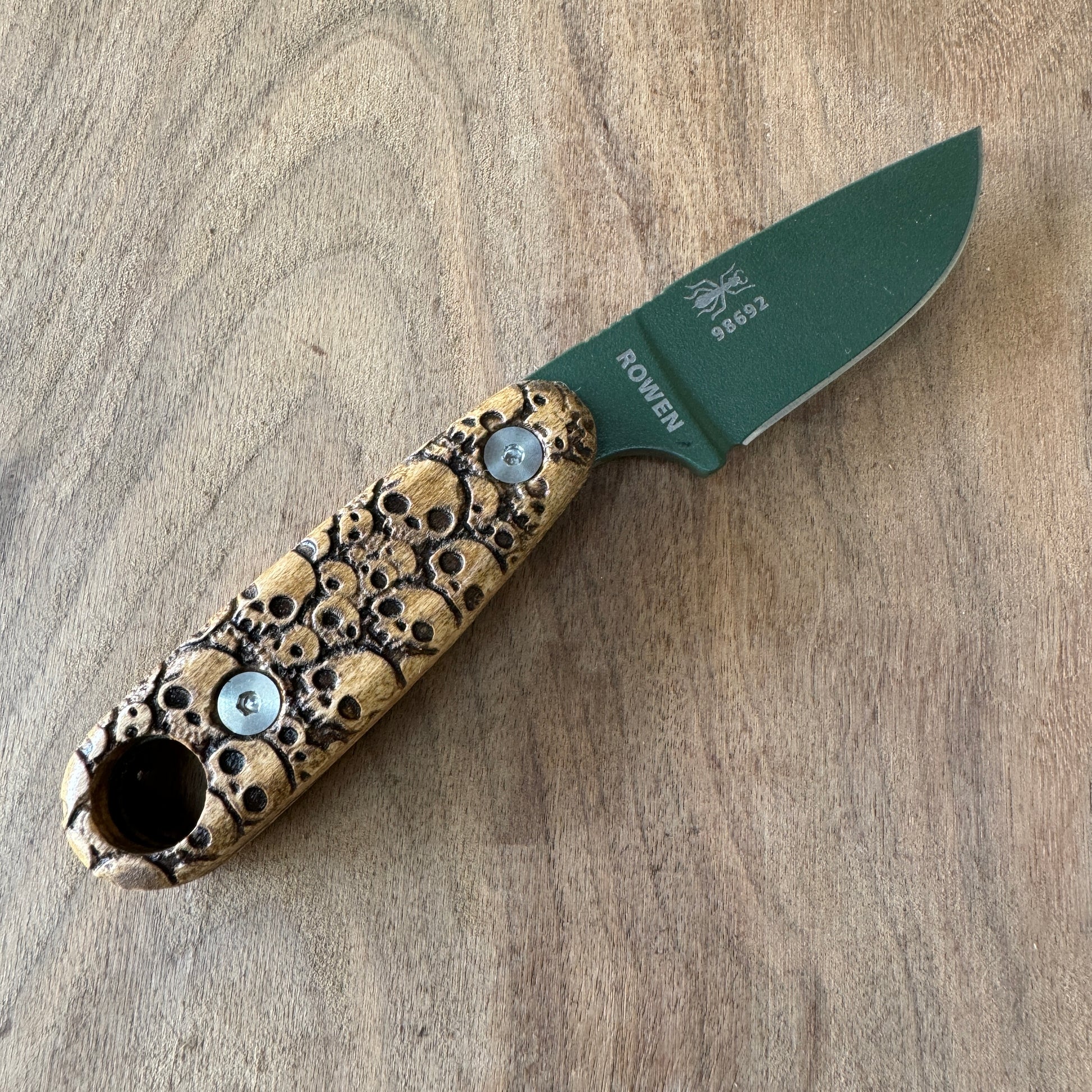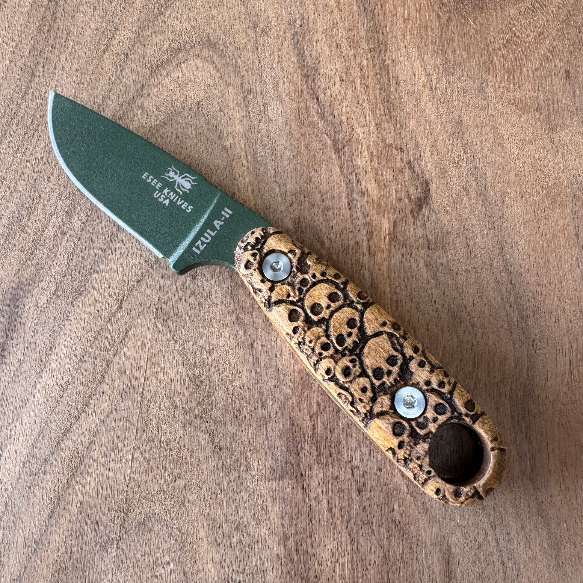 Elevate the look of your ESEE Izula knife with this meticulously crafted handle, designed for enthusiasts who appreciate a touch of the macabre. This handle is not your average accessory; it's a statement piece that combines functionality with a bold aesthetic.