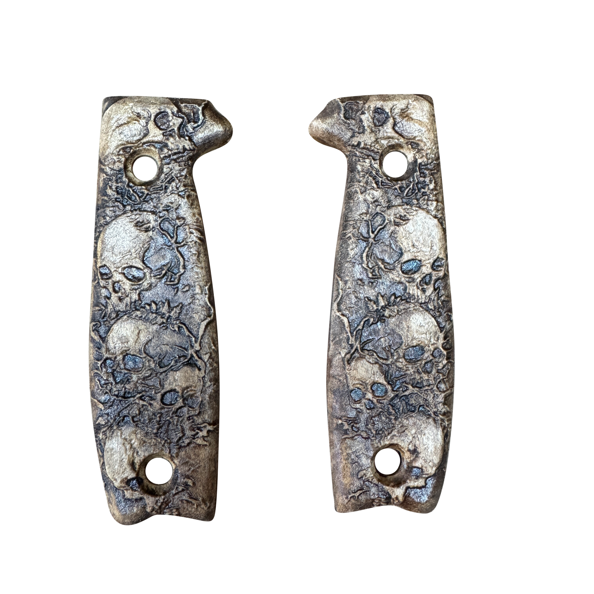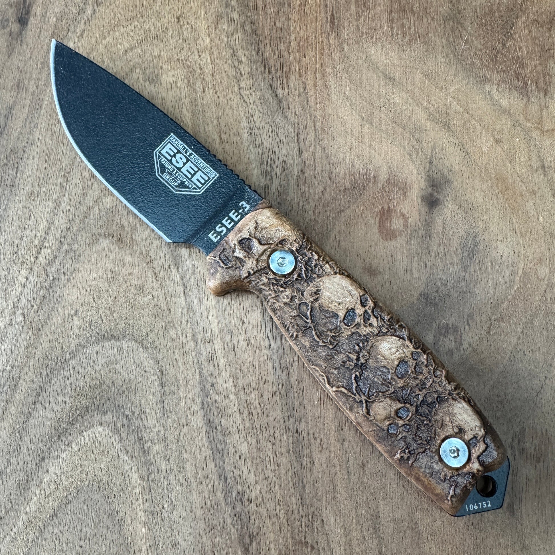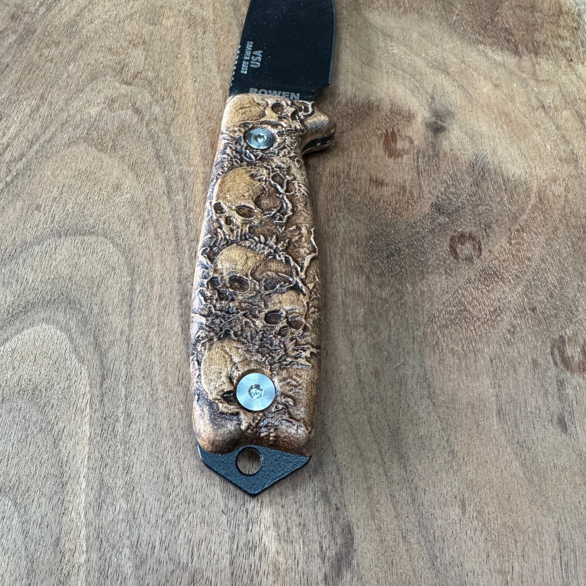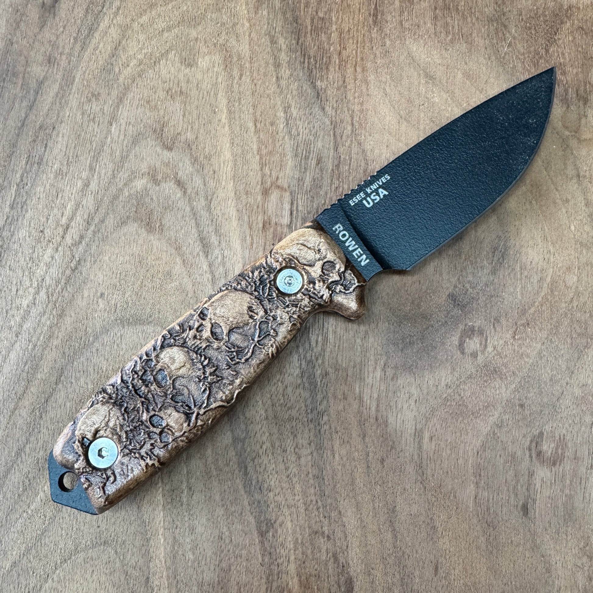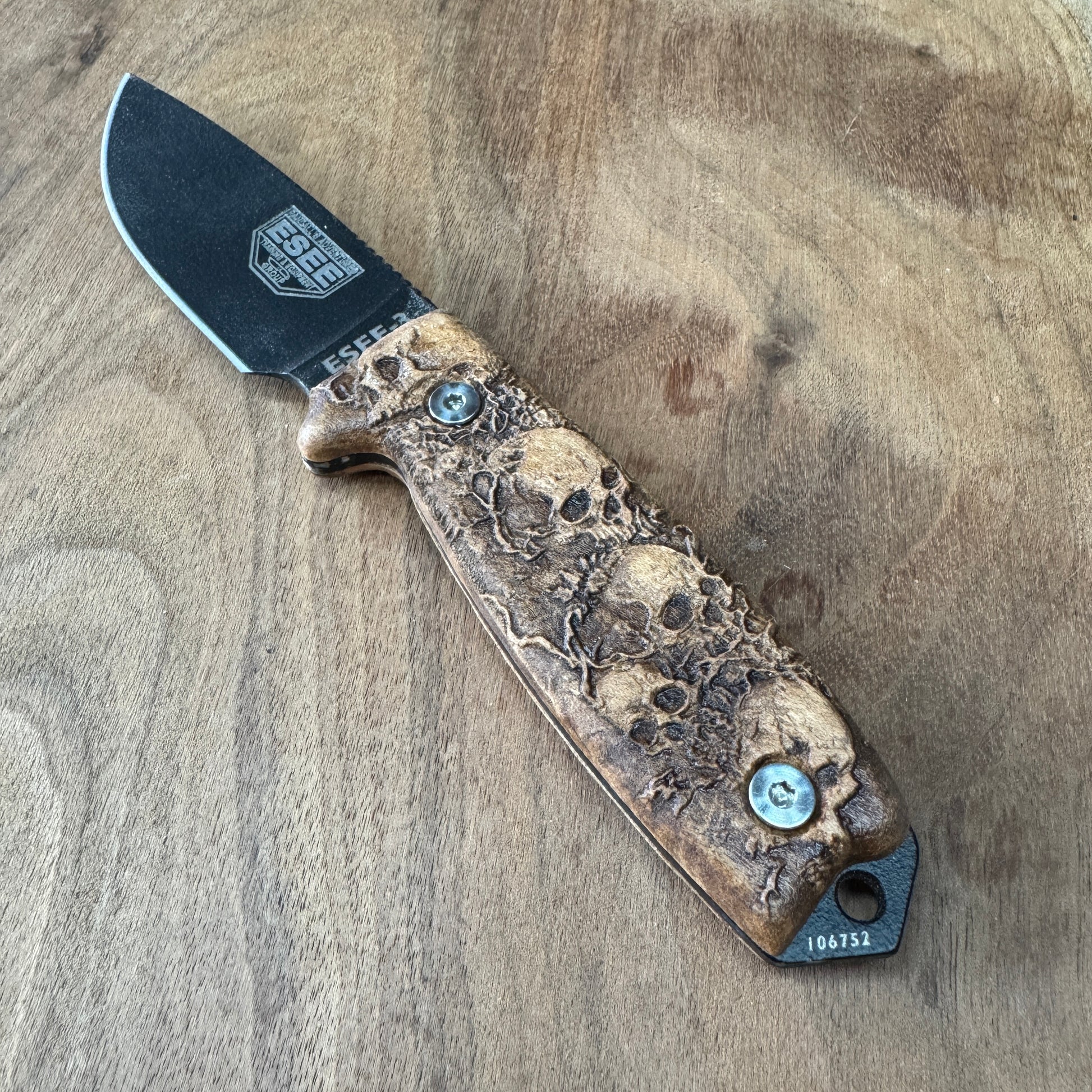 Elevate the look of your ESEE-3/4 knife with this meticulously crafted handle, designed for enthusiasts who appreciate a touch of the macabre. This handle is not your average accessory; it's a statement piece that combines functionality with a bold aesthetic.