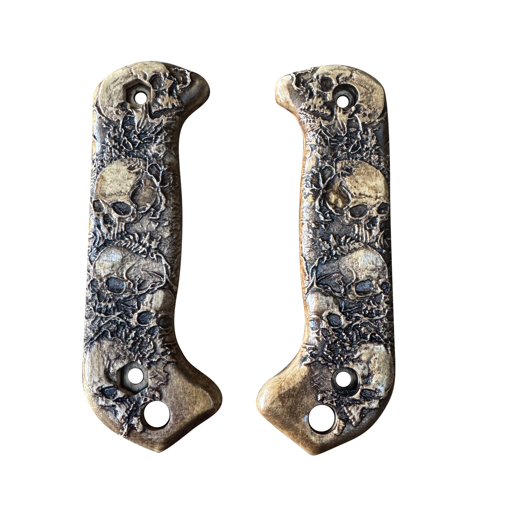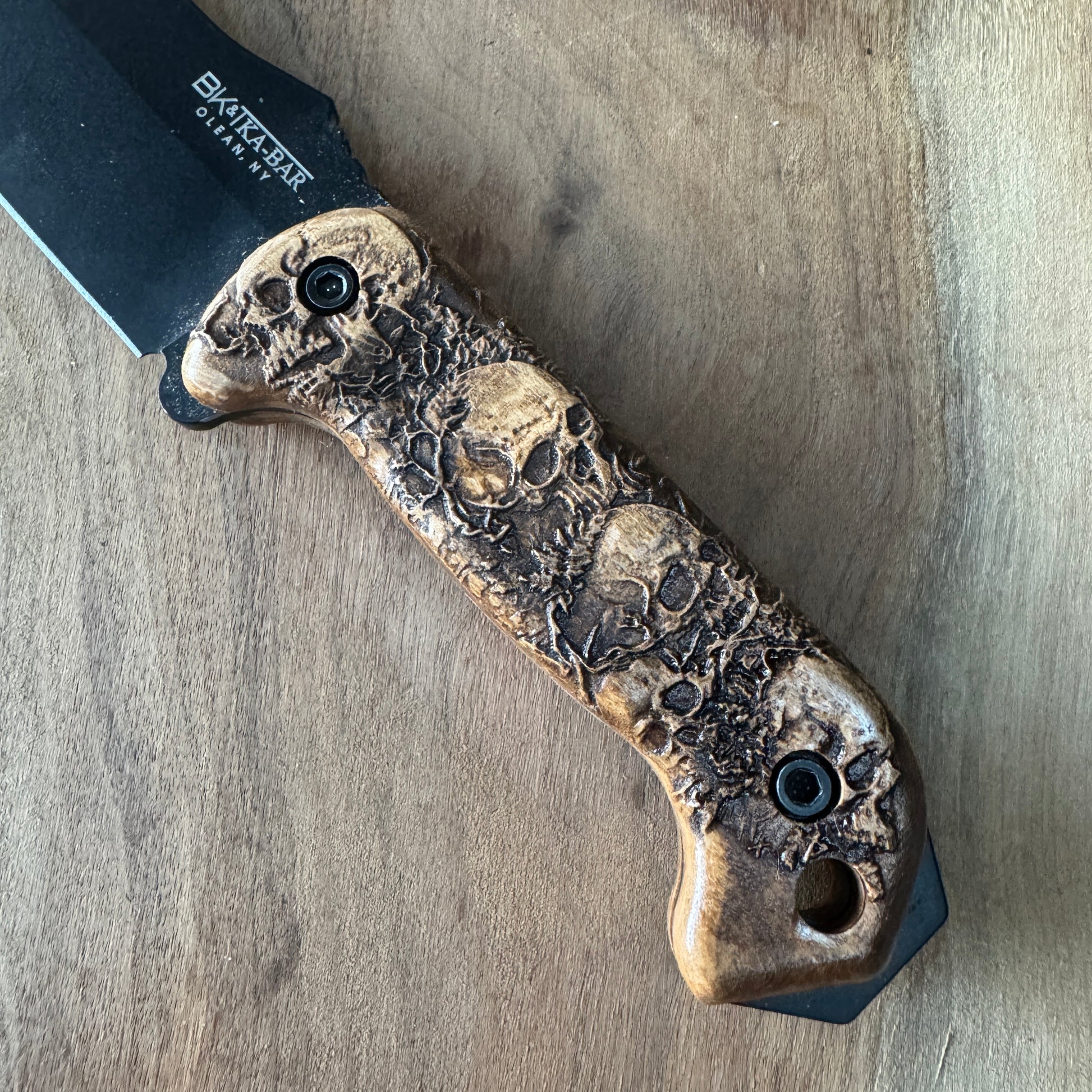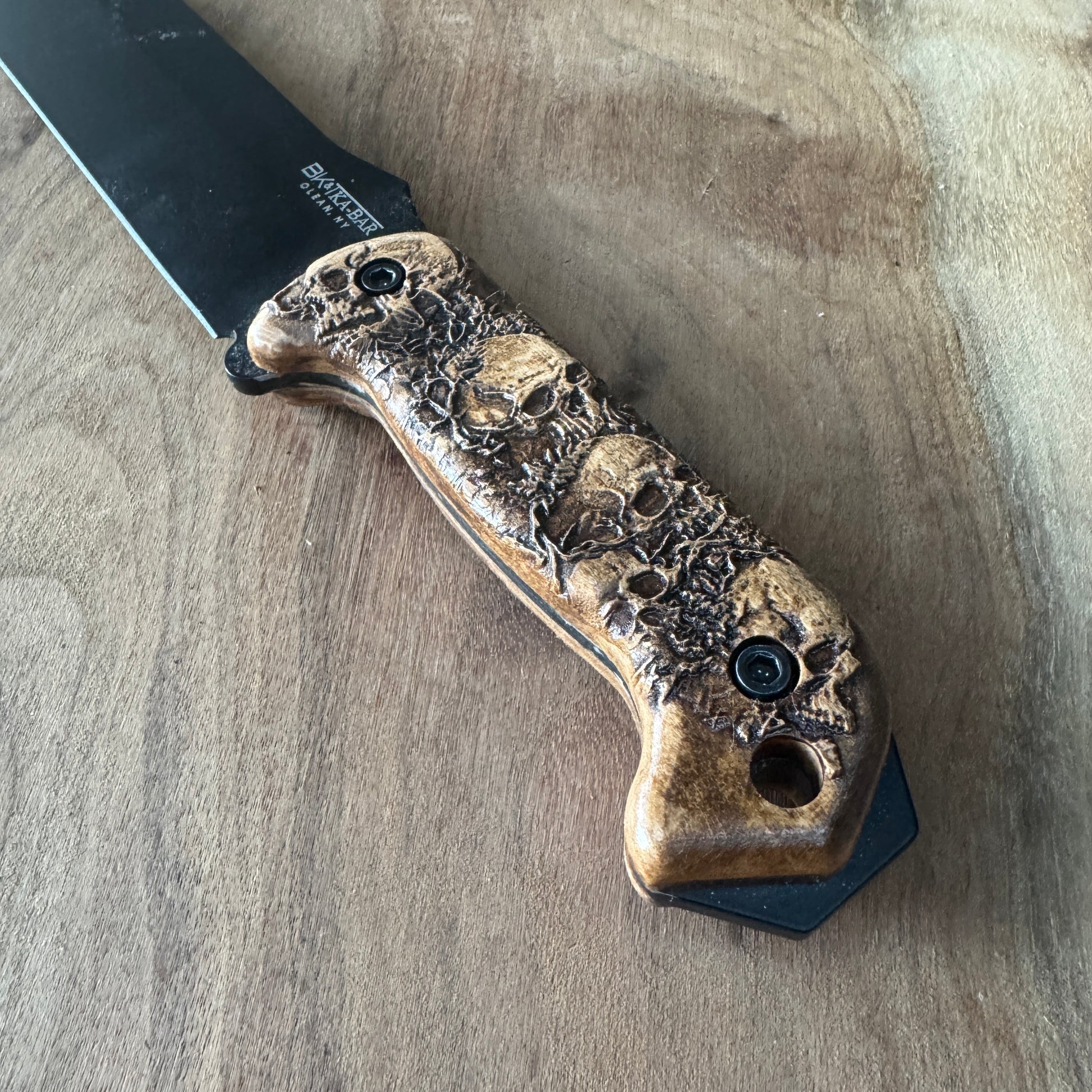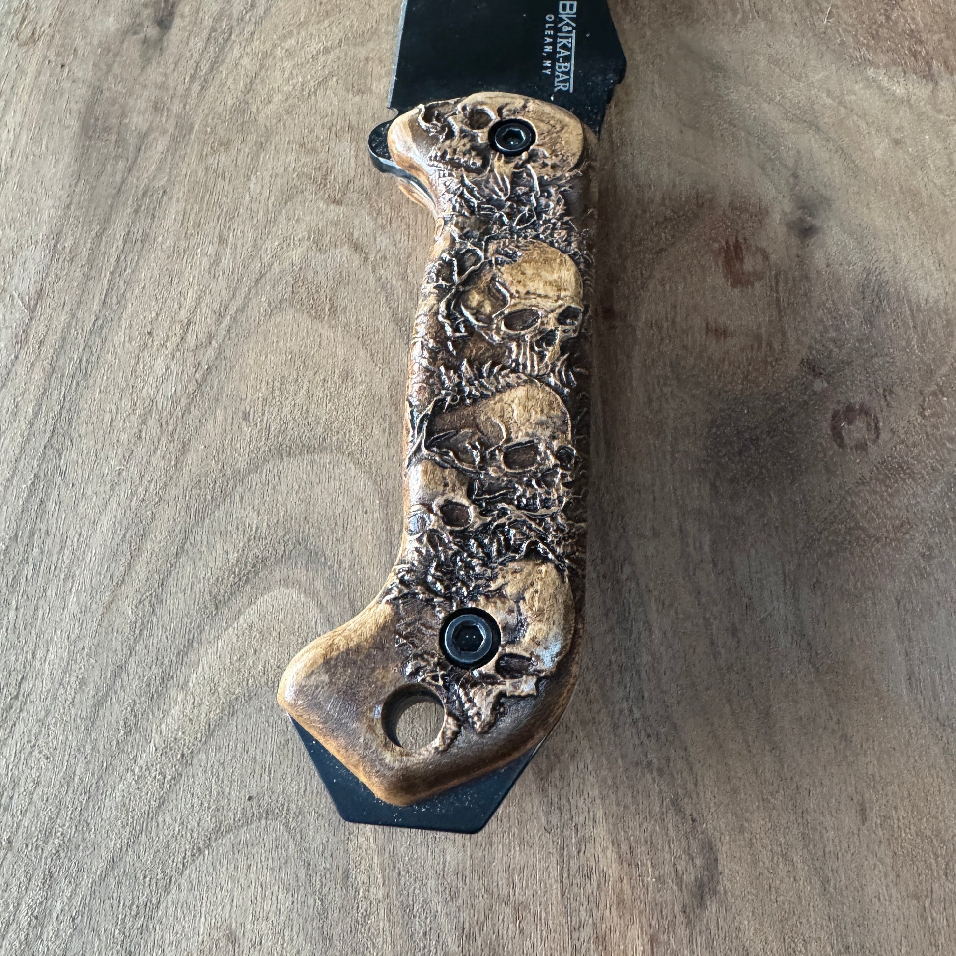 Elevate the look of your Ka-Bar Becker bk-2 bk-7 bk-9 knife with this meticulously crafted handle, designed for enthusiasts who appreciate a touch of the macabre. This handle is not your average accessory; it's a statement piece that combines functionality with a bold aesthetic.