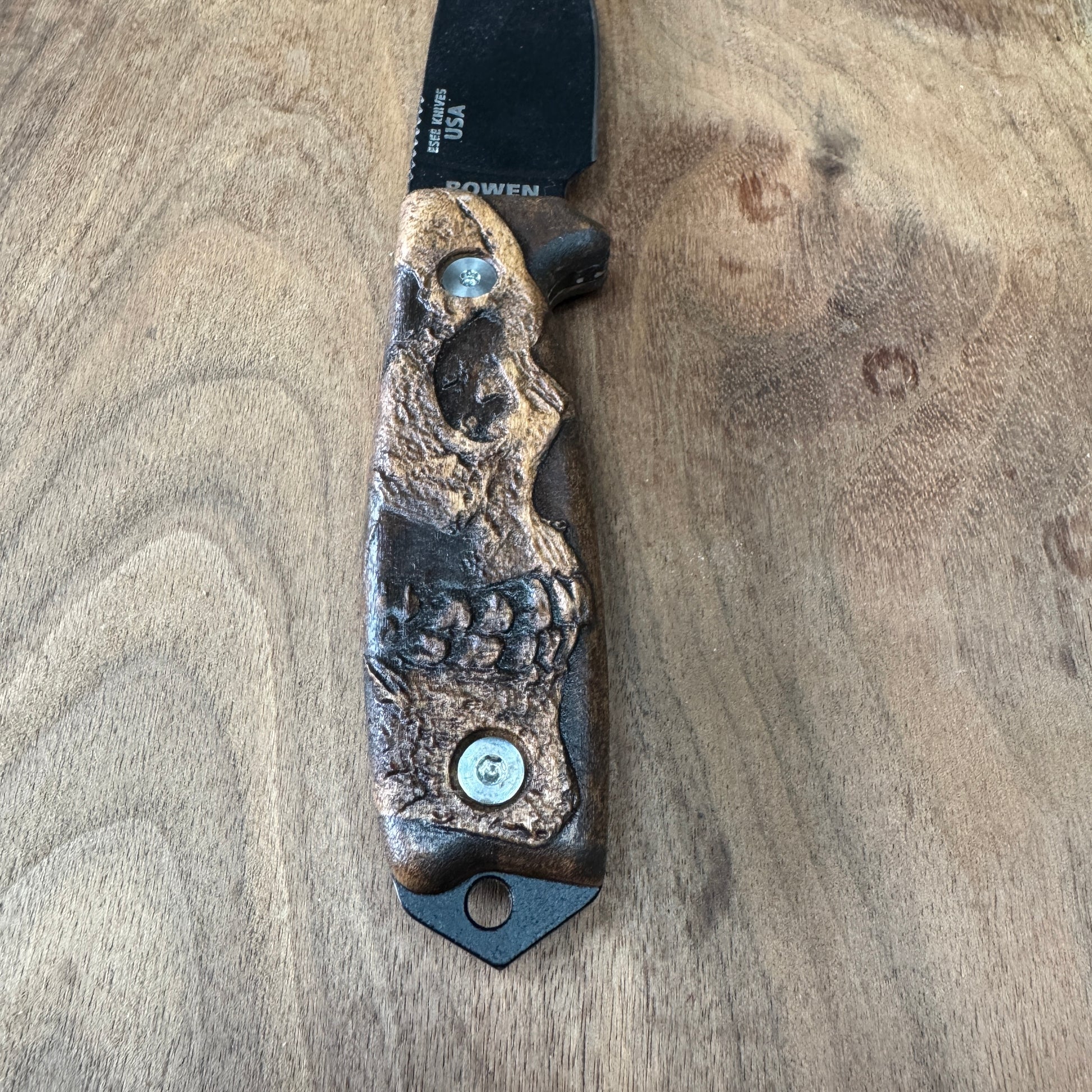 Elevate the look of your ESEE-3/4 knife with this meticulously crafted handle, designed for enthusiasts who appreciate a touch of the macabre. This handle is not your average accessory; it's a statement piece that combines functionality with a bold aesthetic.