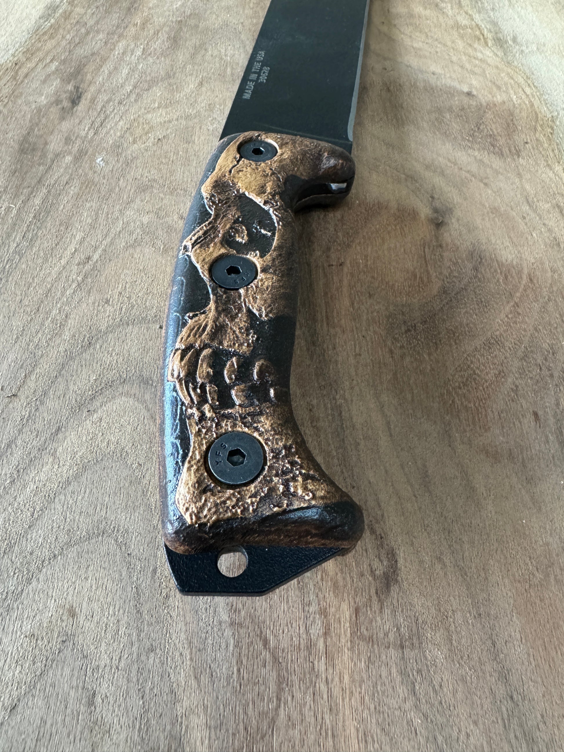 Elevate the look of your ESEE Junglas knife with this meticulously crafted handle, designed for enthusiasts who appreciate a touch of the macabre. This handle is not your average accessory; it's a statement piece that combines functionality with a bold aesthetic.