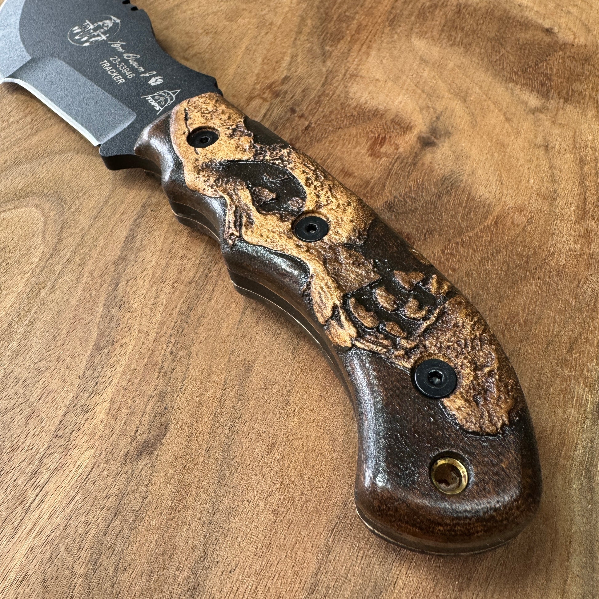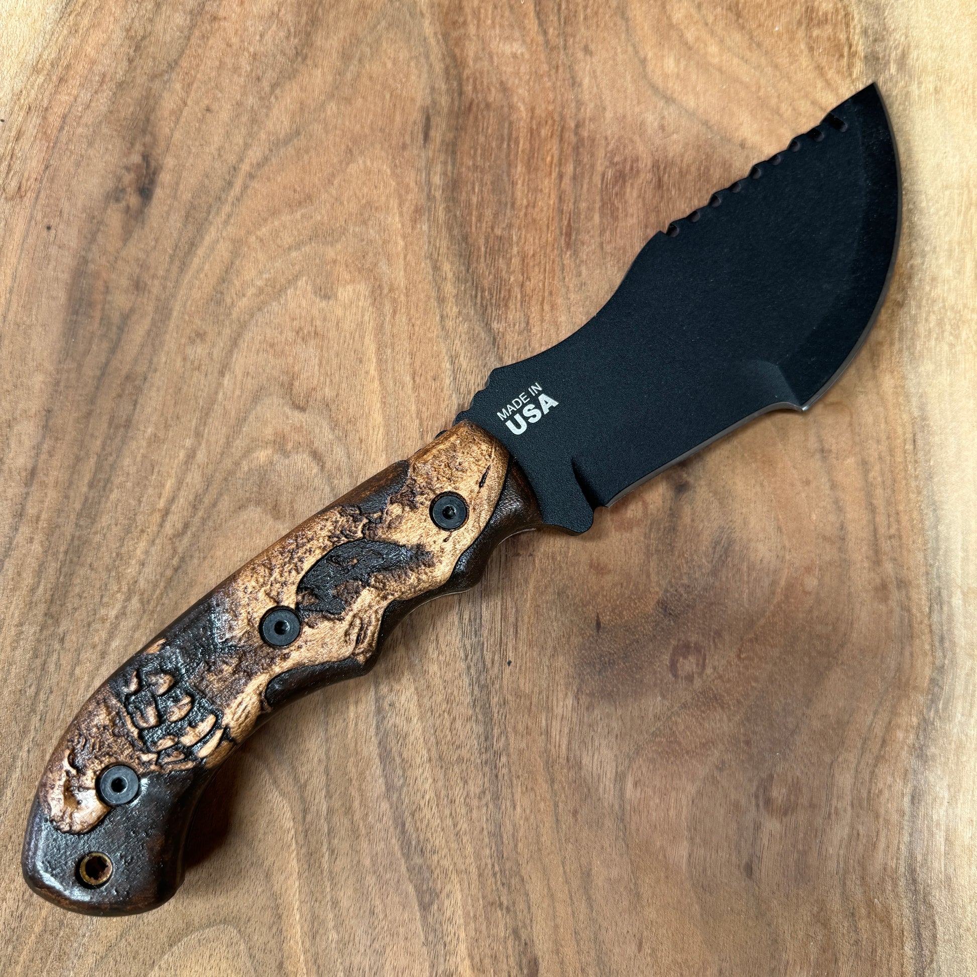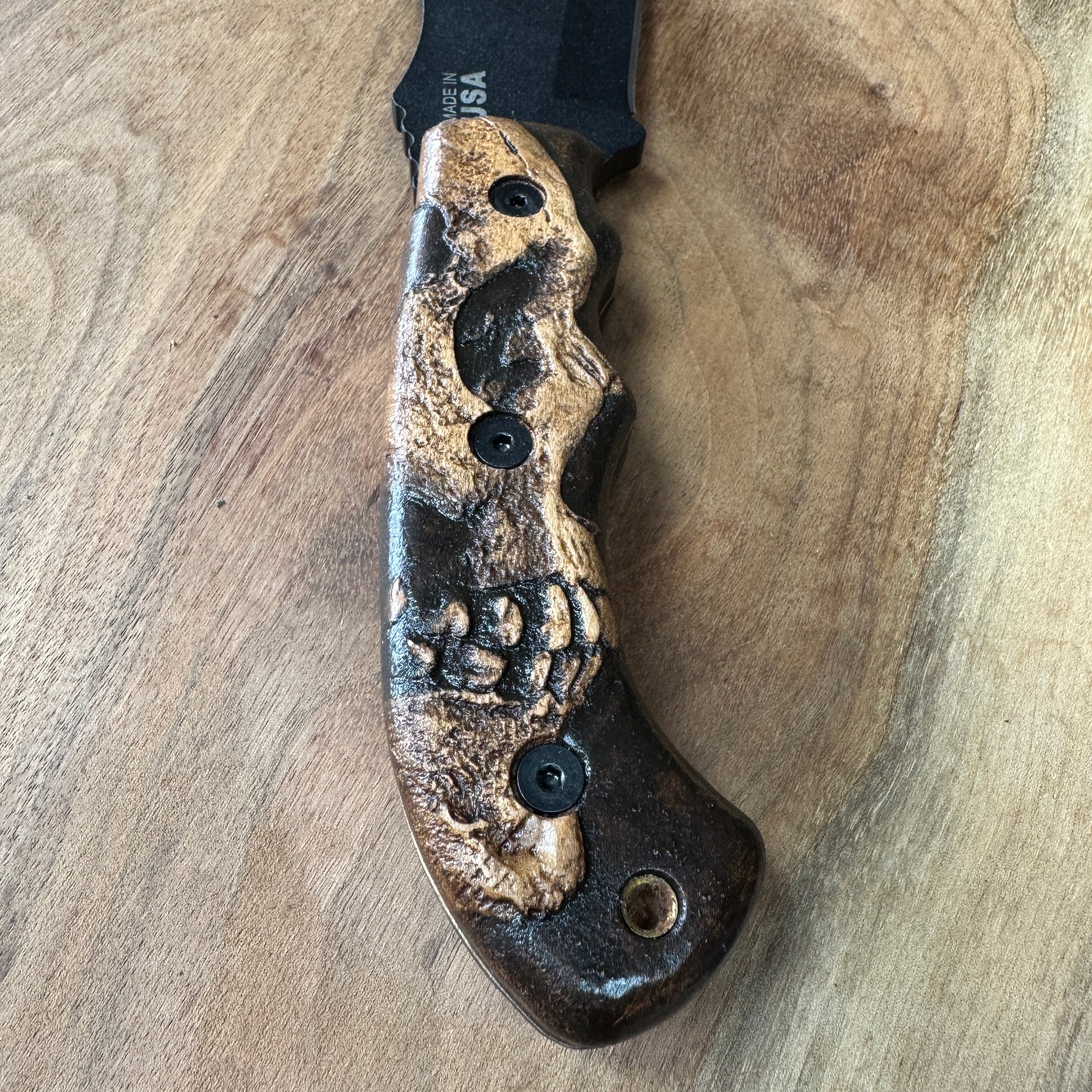Elevate the look of your TOPS Tom Brown Tracker #1 knife with this meticulously crafted handle, designed for enthusiasts who appreciate a touch of the macabre. This handle is not your average accessory; it's a statement piece that combines functionality with a bold aesthetic.