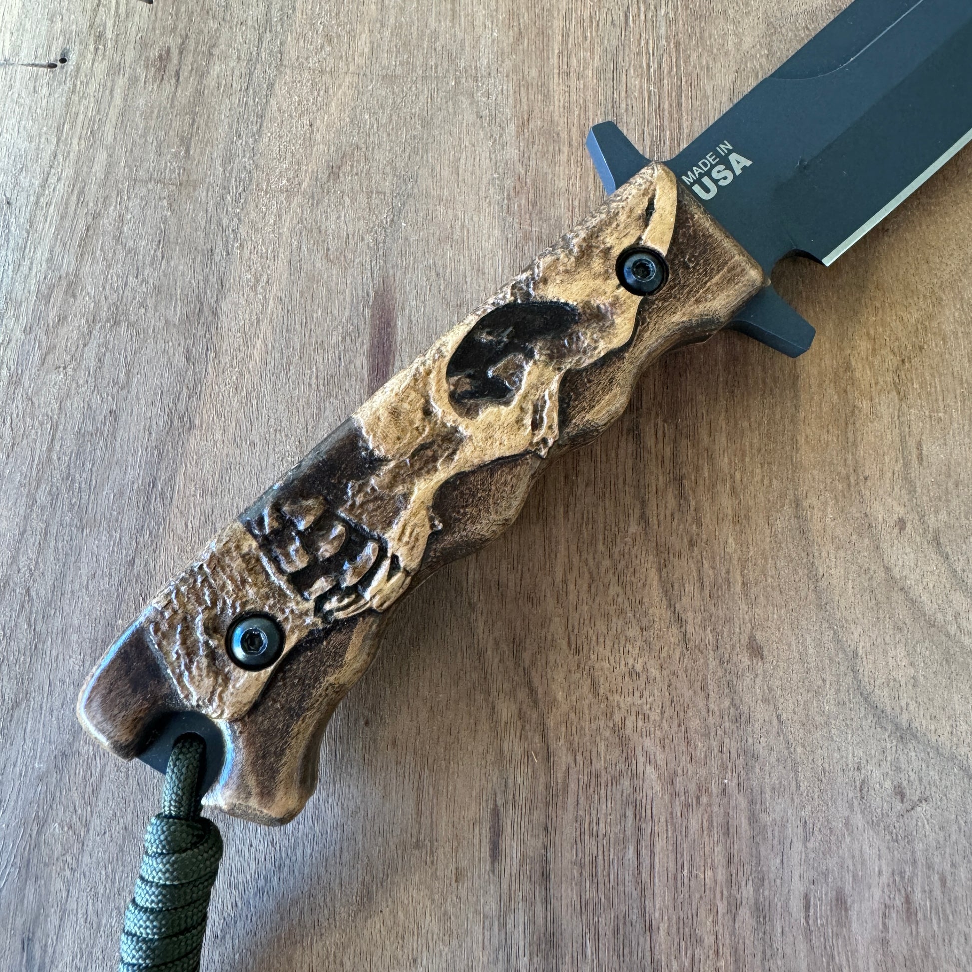 Elevate the look of your TOPS Wild Pig Hunter knife with this meticulously crafted handle, designed for enthusiasts who appreciate a touch of the macabre. This handle is not your average accessory; it's a statement piece that combines functionality with a bold aesthetic.